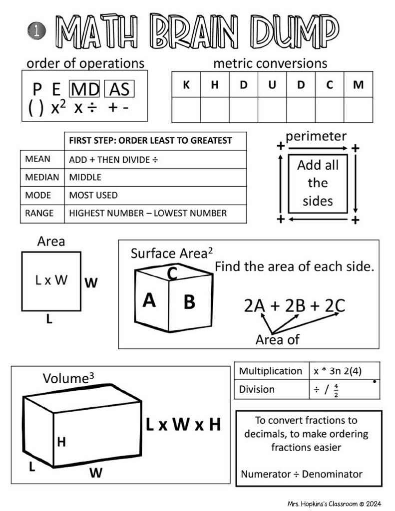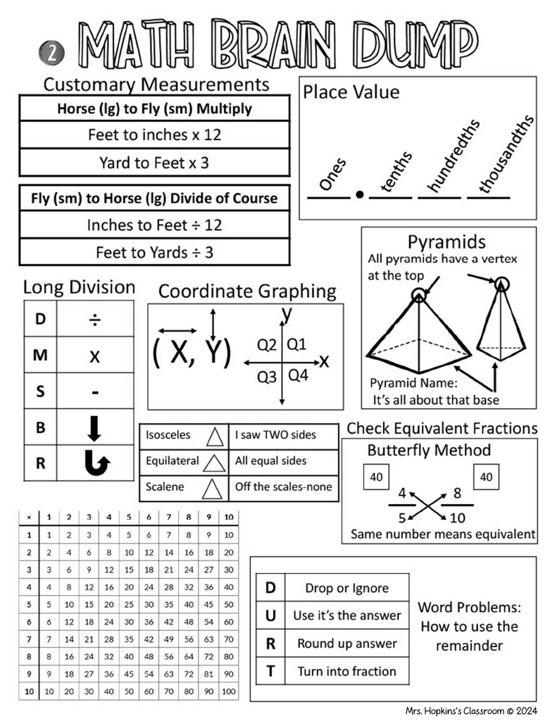 (Here is the brain dump example I gave my 5th graders, and we practiced every morning starting in February-I would set the timer for 5 minutes and have them brain dump all math concepts that would be helpful-they only had to write what they needed help remembering)